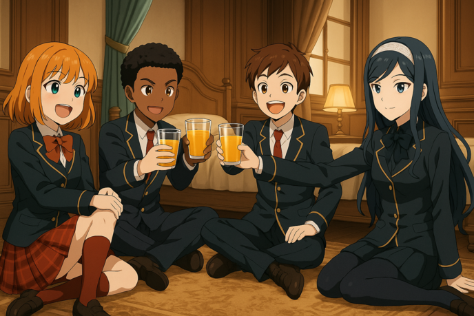 まあ、実際には中身はただオレンジジュースだからね!未成年な俺達がワインなどを飲んでるって寮母のマティ―ルダにバレたら即刻に寮を追い出されること間違いなしだからね!