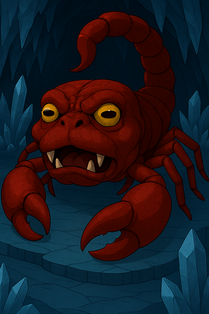 顔の方がぺちゃんこになってるような潰れた蛙のような醜すぎる虎の容貌がした頭部に続いて、全身が赤い一色で統一された巨大な蠍が見えたようだ。