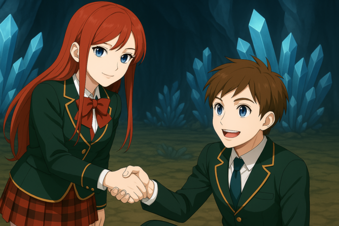 僕に手を差し出して立ち上がらせてくれたのは凛々しいまでにかっこいい雰囲気を纏う男勝りな赤い髪の毛ロングヘアを持ってる少女で、どこか愛想笑いが苦手なようで、事務的な微笑とシリアスと憂いがすべて混沌的に混じってる微妙な表情を向けてきてる。