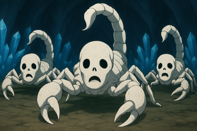 あそこに切り落とされた鋏のついてる最先端部分の尾が転がってるし、それで怯んだのか蠍のバケモノが急にお腹の中へと仕舞いこんだようで脅威がひとつ減って楽になったって感じわよね!