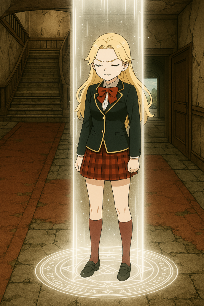 イリナが手指を鳴らすと、小銭みたいな物体が前方の床に転がってるままでいきなり物体が閃光を帯びたような爆発をした後、魔法陣が浮かび上がったと同時に円筒形の小さな魔術的な柱がその床の魔法陣からせり上がってるように形成された。