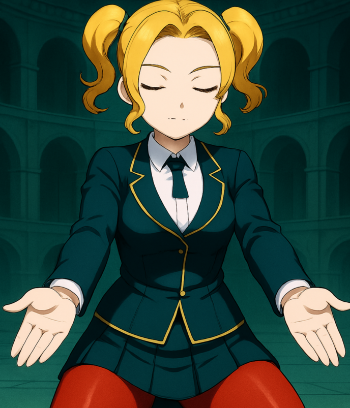 いきなり大人しくなって瞑想でもしてるように両目を閉じて、両腕を左右別々の斜め前方のこちら方向に手のひらを上向けにしながら、両脚を大きく開いてるそのような姿勢はー?彼女の赤い色のタイツがより強調されて、なんか目を奪われるポーズとなってるんだけどぉー!?