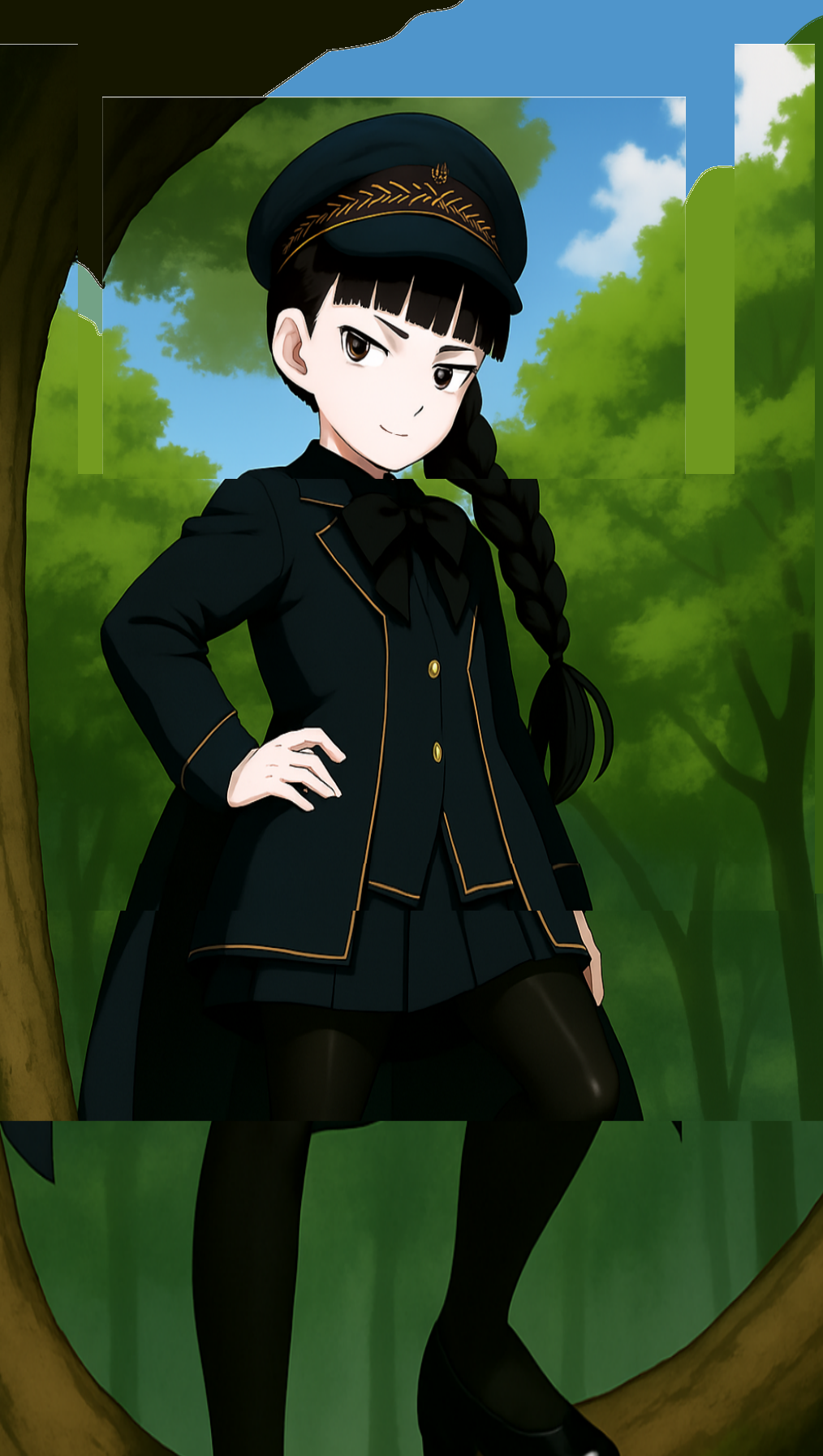 学生用でも軍隊用とも取れる帽子を被っているその黒髪してる短めのセミロングっ子は、横髪の両方を三つ編みにして、右側の方が長めのようだ!目が琥珀色をしていて、俺達を射貫くような冷たさを感じる!