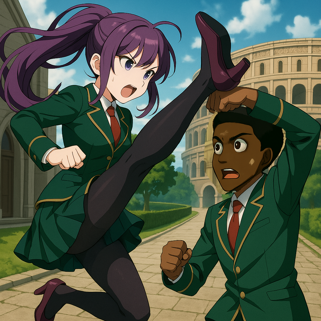 「オケウエーー!この状況はまずいっすねーー!もしヒルドレッド嬢さんが我慢できずに襲い掛かると、こんな大勢な人もいる場で教師の一人だけでも目撃してると校則違反になるっすよーー!!」