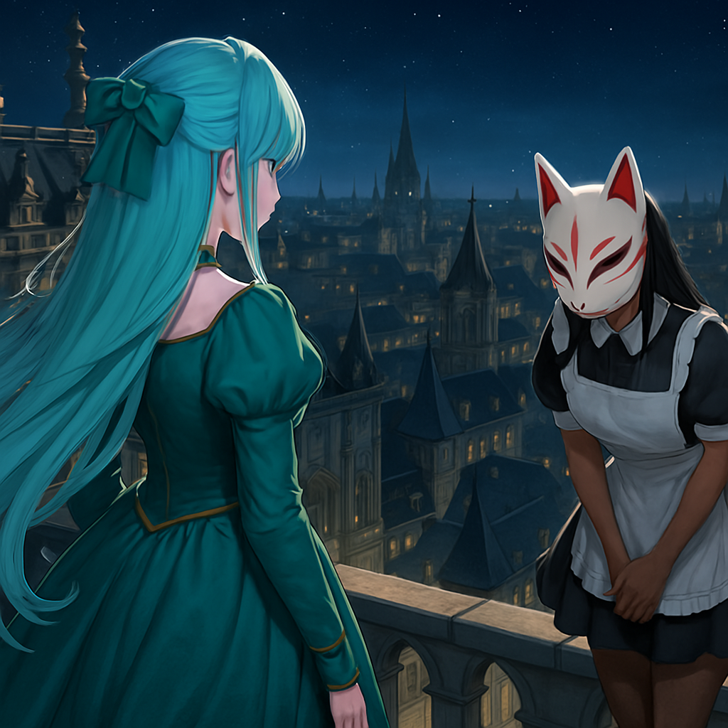 思考に耽ったいたルミナリス王女に、いきなり狐の仮面を被っているスカート超短めのメイド服を着ている少女が屋根に降り立って、王女の側に首を垂れる!