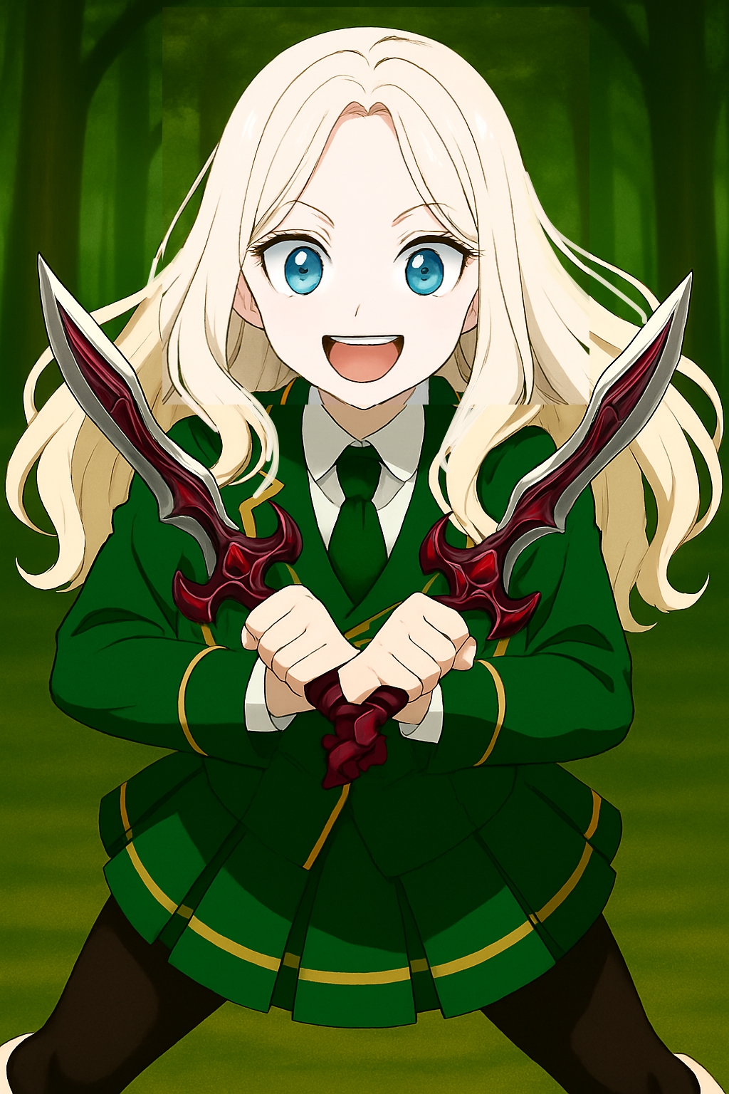 今、ジェームズの目の前にはリーリスの両手にに握り持っている2刀の対となっているコンバットナイフがあり、どっちも柄の部分が紫色と紅色に深く彩られているようだ!