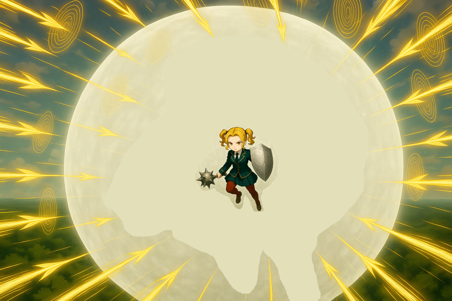 でも、もちろんサイズとして見たら、オケウエーの球体の方が何十倍も大きいのだが...(前のルネヨー・フラックシスにてヒルドレッドの精霊の真体姿になった時に発動した【大守白霊防壁グレート・ホワイトスピリット・バリアー】という広範囲な障壁じゃあるまいし、オケウエーの『聖封シリーズの白い球体』より大きさでは負ける方なので)