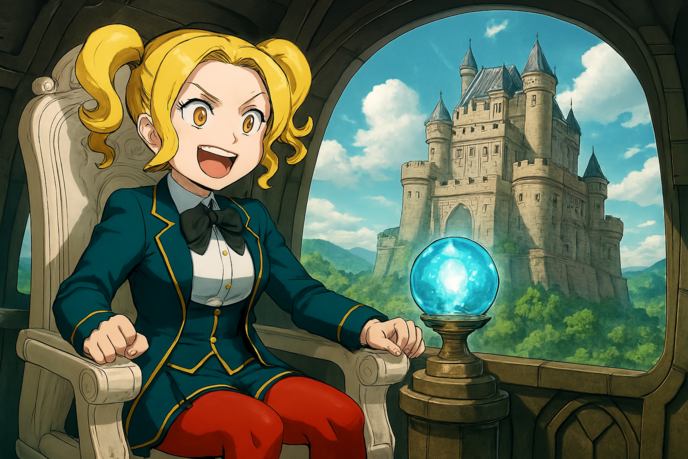 なので、すっかり巨大な砦のような大型な城の操縦室の中へと吸い込まれていったわたくしは操縦席である玉座に座ると、部屋にある魔道クリスタルを通して、城の外の光景が良く見えるよう映像が映し出されてますわ!