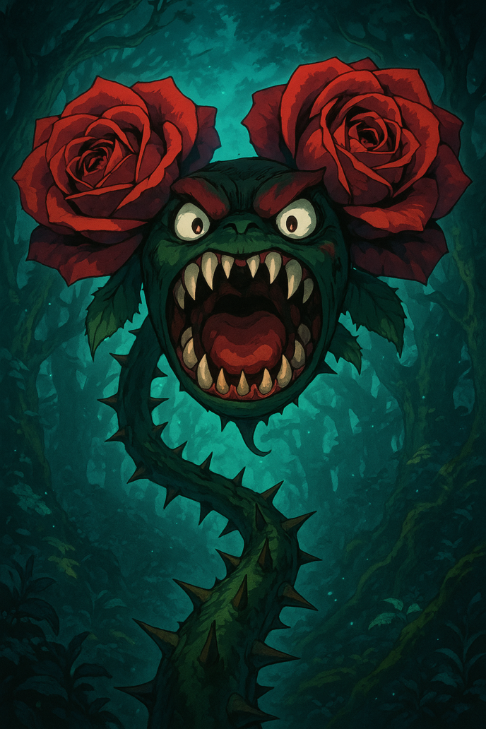 茨の鞭の先端がオードリーの位置へ近づくと、いきなりその先端の周りにある二つの薔薇の花が巨大化すると、中心にある『可愛い顔』がいきなり怒ったような『憤怒の顔』に切り替わると、それも巨大化して、鋭い牙がいっぱい並んでいる口腔を開けて、オードリーを呑み込もうとしてきたがー