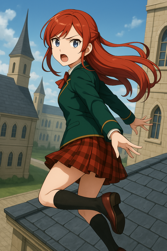 ニナに言い当てられ、肯定したシャルロットだったが、ジェームズのことが心配みたいな口ぶりをした彼女が退散するといって学院本棟の保健室へと走り出すために屋根から飛び降りようとするとー
