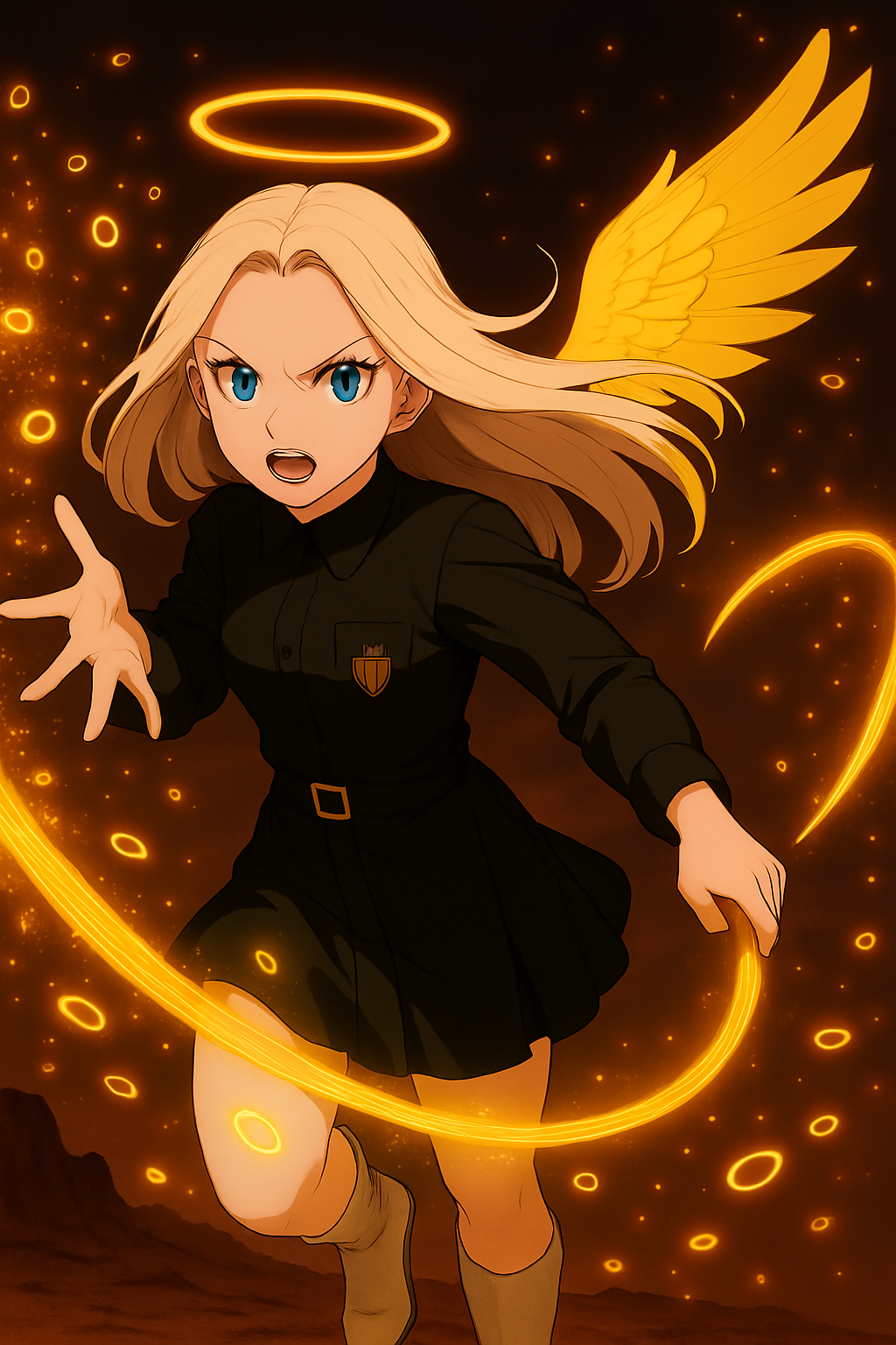クリスは左手で握り持っているリボンっぽい黄金色な波状なオーラを揺らしたら、花火みたいなけたたましい音が発生すると同時に、振られたリボンっぽいオーラからは夥しい程の黄金色の小さな輪たちが変貌した姿の犯人少女へ向けて飛んでいったーーー!