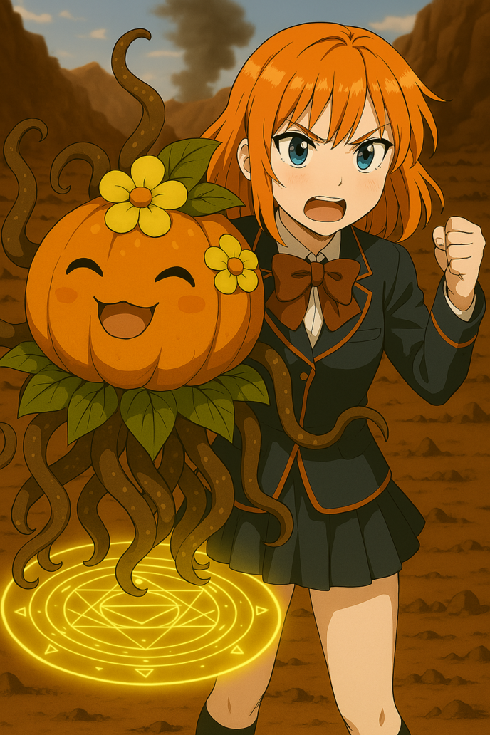 変な鳴き声と共に現れたのがジュディの真体姿している契約精霊である【フロンデルヒート】で、体形はジュディより少しだけ一回り大きい、黄色の花々と葉っぱが生えている丸っこいオレンジ色の植物のような体をしている精霊。