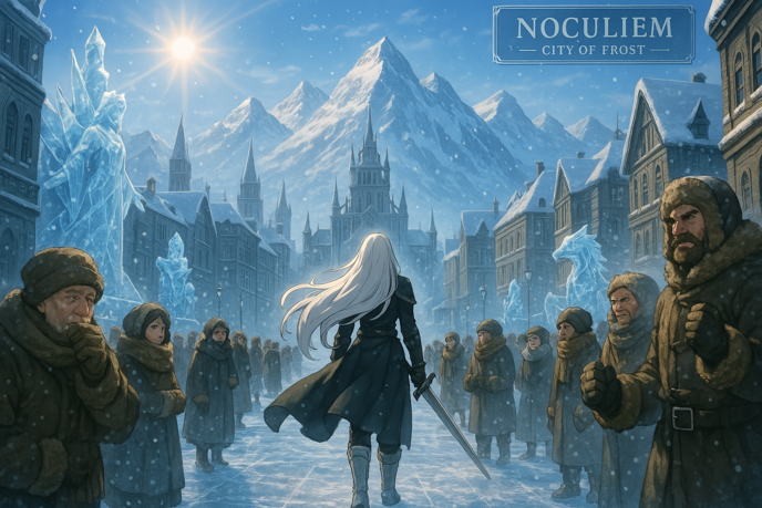 王国の北に位置するこのアズリア地域の【ノキューリエム】という首都的都市は、氷の彫刻が街角を飾る「氷霜の都」としても知られていた。遠くには、万年雪に覆われた山々がそびえ立ち、その峰々はまるで天を貫く氷の槍のようだった。
