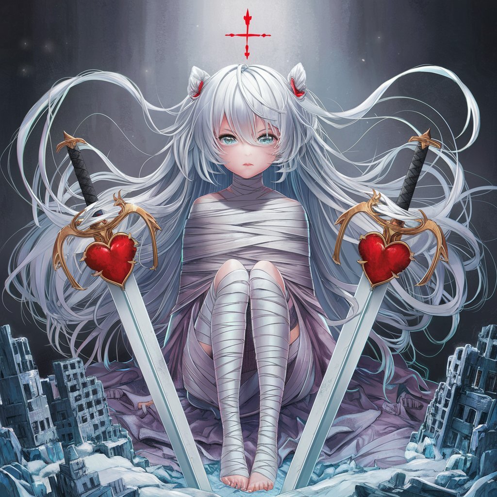 目の前には、俺に後ろ姿を見せ、契約をルネヨー・フラックシスに済ませてから精霊術学院に帰って来てからのいつもの制服姿で顕現してきた【真体姿トゥルー=フォーム】の髪型がクラウン型なイーズじゃなくて、髪が自由に長髪になって伸ばされ、最初にあった時の全身を包帯に薄く巻かれていて白い肌もところどころ覗かせてるその幼いながらも妖艶っぽい恰好をしているイーズベリアになったんだが、それを更に豪華な姿として頭の上には小さな赤い色の十字架が浮かんでいて、そしてその両手に持ってるのは豪華な形している対となってるブロードソードのような大剣を軽々しく片手で握り持っているイーズベリアがいるのだ!