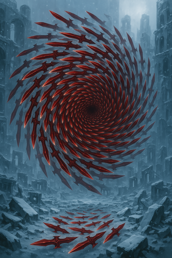 そう!何十ものナイフの大群層で自身の身体を包み尽くして雪と氷の粒どころか塵一片すらも寄せ付けないその飛び回ってるコンバットナイフ達って【武器化したベリヘリヤール】はそれぞれに鋭いキラキラとした光沢をその刀身から反射させながら、夥しい程の【聖魔力量】がその全ての何千もの刃から発されてるのを感じた!
