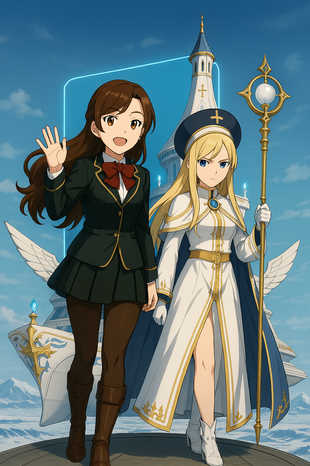 彼女のストレートヘアな長髪がしている頭には、威厳に満ちた円形の高位魔導師の帽子が乗せられ、神聖なる気配を放っている。衣装は白を基調とした優雅な聖職者の制服であり、細やかな装飾が施されたロングスカートがふわりと揺れる。しかし、そのスカートには片脚を大胆に見せるスリットが入り、そこから覗くのは輝くような純白のタイツと真っ白いハイヒールブーツに包まれた美しき脚線美。神秘的で崇高な雰囲気を纏いながらも、どこかセクシーで幻想的な魅力を醸し出している。