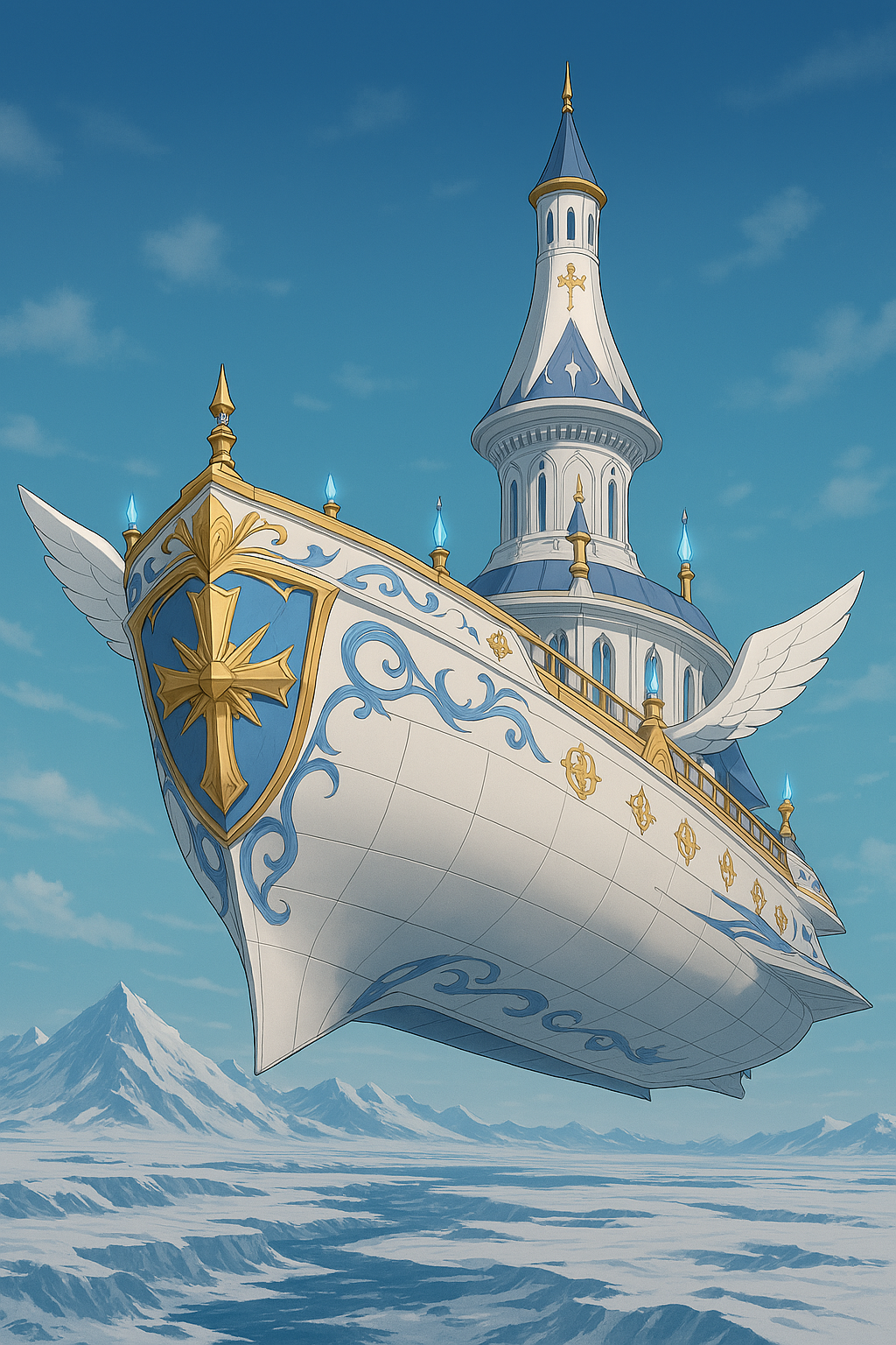 全長六百メートルに及ぶその巨体は、厳粛なる神の意志を映し出すかのように、荘厳で威厳に満ちた外観を誇る。船体は白銀の装甲に覆われ、流麗な青の装飾が聖なる象徴として各所に刻まれている。艦首には巨大な神聖紋章が刻まれ、そこから伸びる鋭利な艦首翼が、まるで天使の翼のように優雅に広がる。
