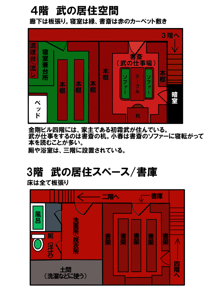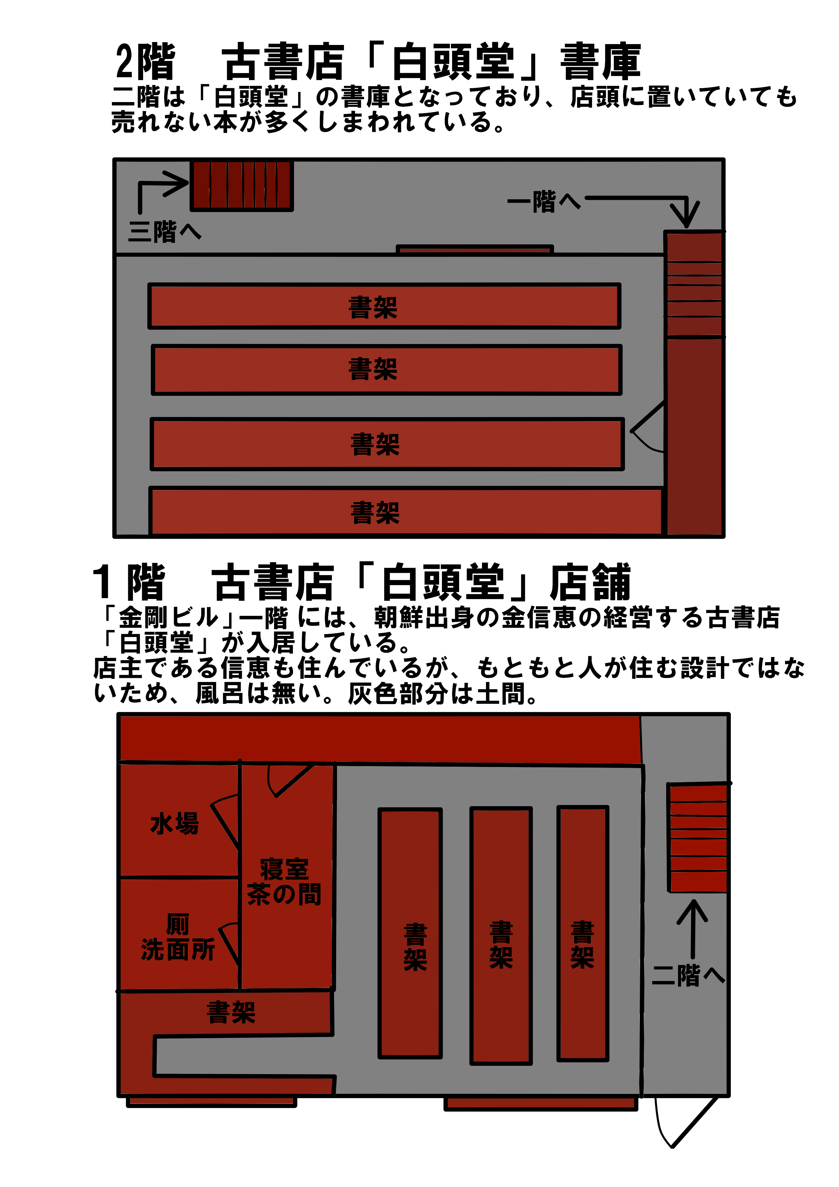 一、二階に金信恵の営む古書店「白頭堂」が入居。それ以外は武の居住スペースになっている。