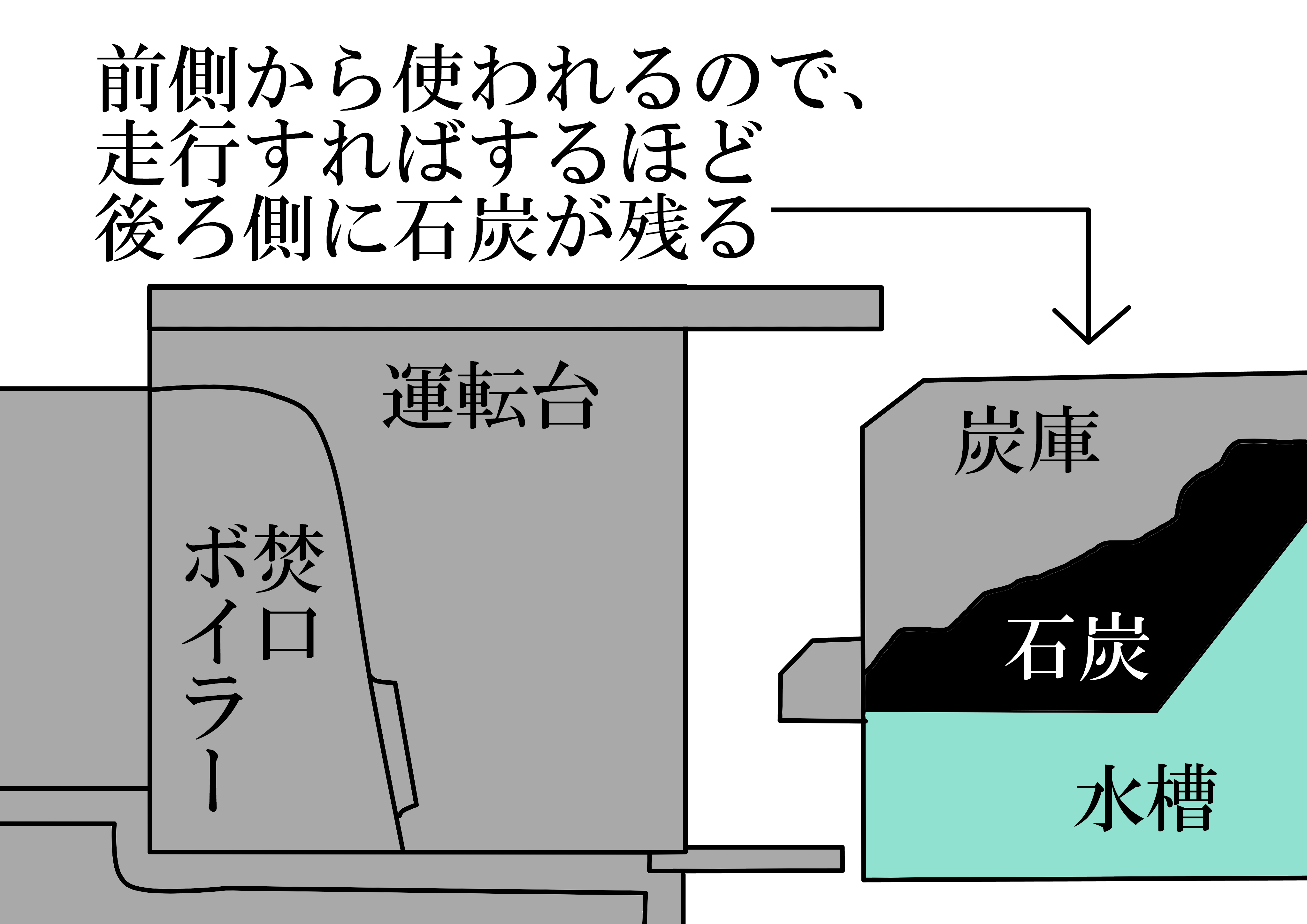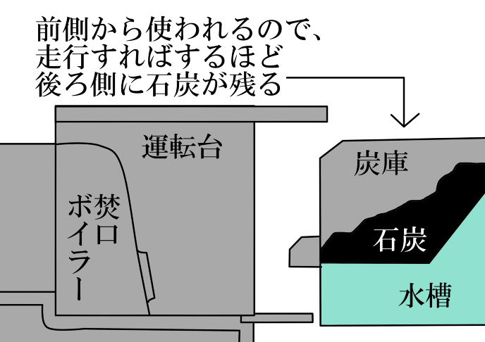 「機関車の炭水車には、石炭と水が積まれている。機関助士は手前側から石炭を消費していくから、どうしても長距離を走ると手の届きにくい後ろ側に石炭が偏ってしまう。だから、主要駅などでは炭水手が炭庫に上り、石炭を前側にかき寄せる作業が行われるんだ」