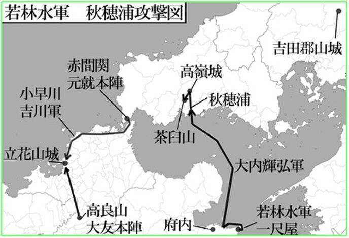 主力は博多北の立花。大将の毛利元就は下関の先、赤間関にいたため毛利軍は大いに動揺した。