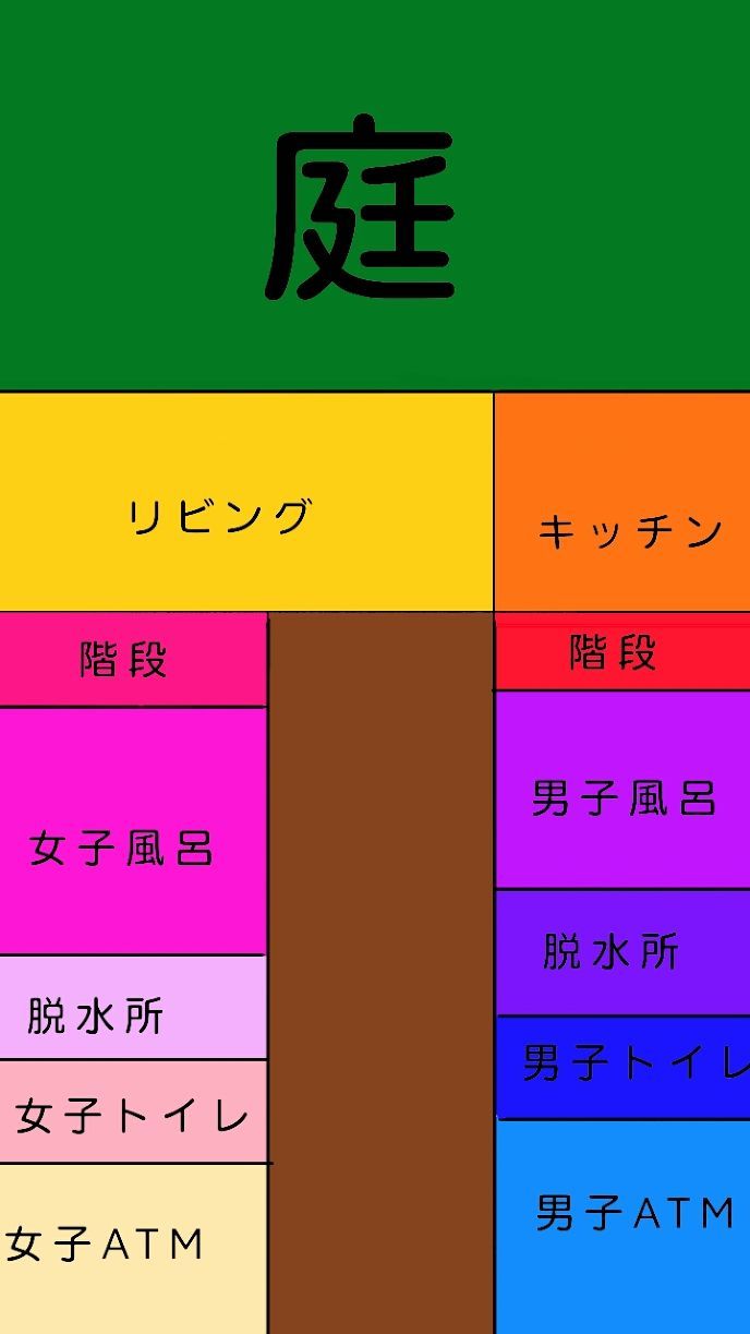「これは、これからあなた達が過ごしていく家の間取りです。リビングには、椅子と机がならんであり、そこでご飯を食べます。ATMは、動いた歩数×10で計算され、お金が加算されていきます。そのお金で家具などを買いましょう。次にこちらをご覧ください。」