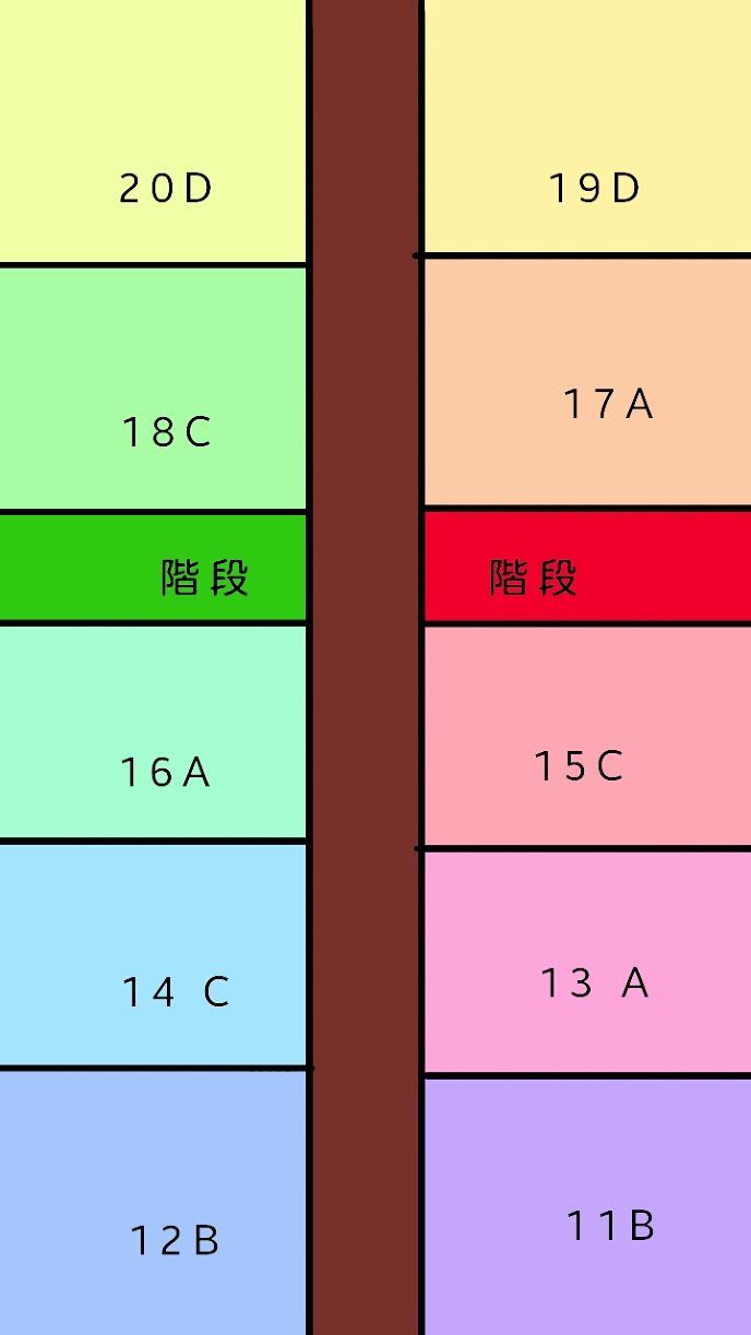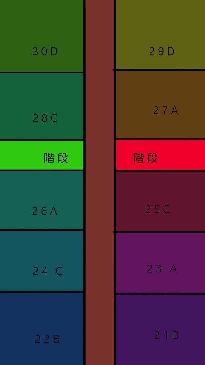 「これは、部屋の割り振りです。自分の出席番号の部屋へ行きましょう。各部屋にはセキュリティカードが設置されており、部屋で利用するか利用しないかは設定できます。セキュリティカードは、画面に出ている色のものです。ABCDは、部屋の窓どりのパターンです。こちらをご覧ください。」