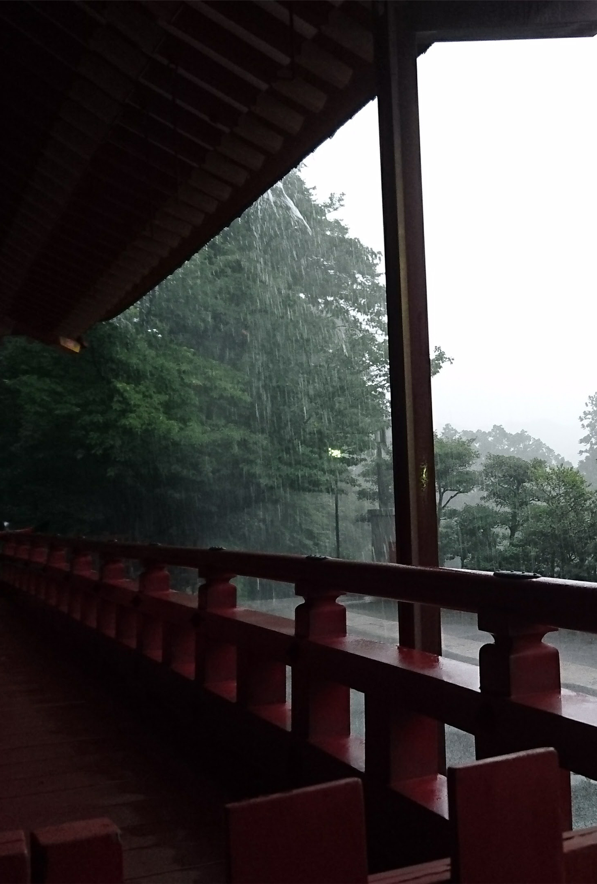 雨の向こうに、百万比咩神社の大きな瓦屋根のならびがある。