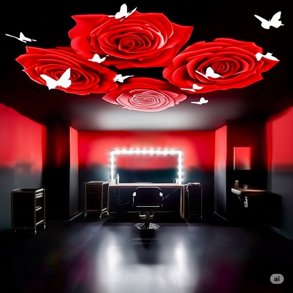 天井を見上げると…全体が黒ベースに真っ赤で大っきな4つの薔薇の花と、その周りをひらひらと飛ぶ象牙色の蝶たち…壁は上半分が赤で下半分が黒のグラデーション…。