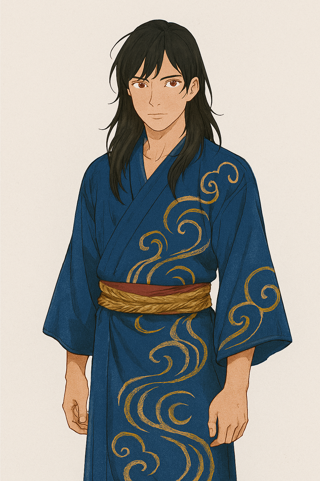 • 服装/持ち物:紺地の着物、金の雲刺繍/緑の石