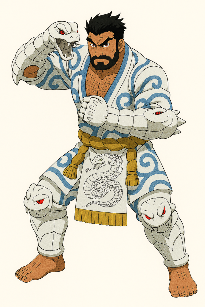 前垂れ(化粧まわし)には白蛇がとぐろを巻いた姿を描写