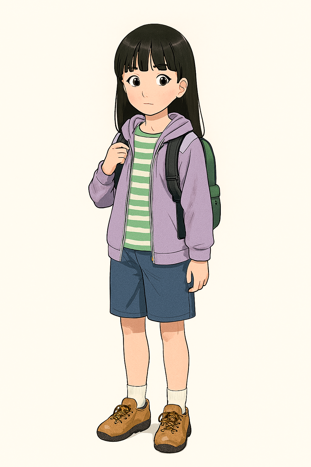 • 服装/持ち物:山に遠足に来たスタイル、白と黄緑のボーダーシャツ、うす紫のパーカー、青色の半ズボン、白靴下、茶色のスニーカー