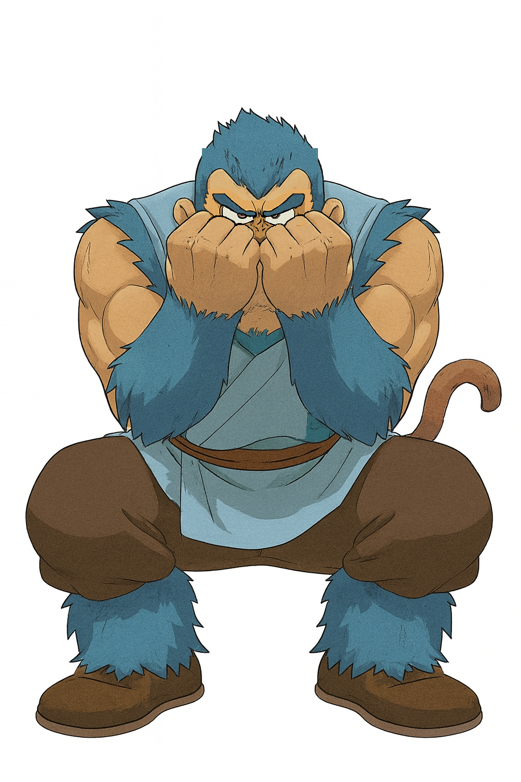 • 目の色/表情の特徴:黒/ゴリラ系、左右の眉毛が繋がっている、無精ひげが口回り顎周りに水色にある、岩も食べるので下あごがごつい