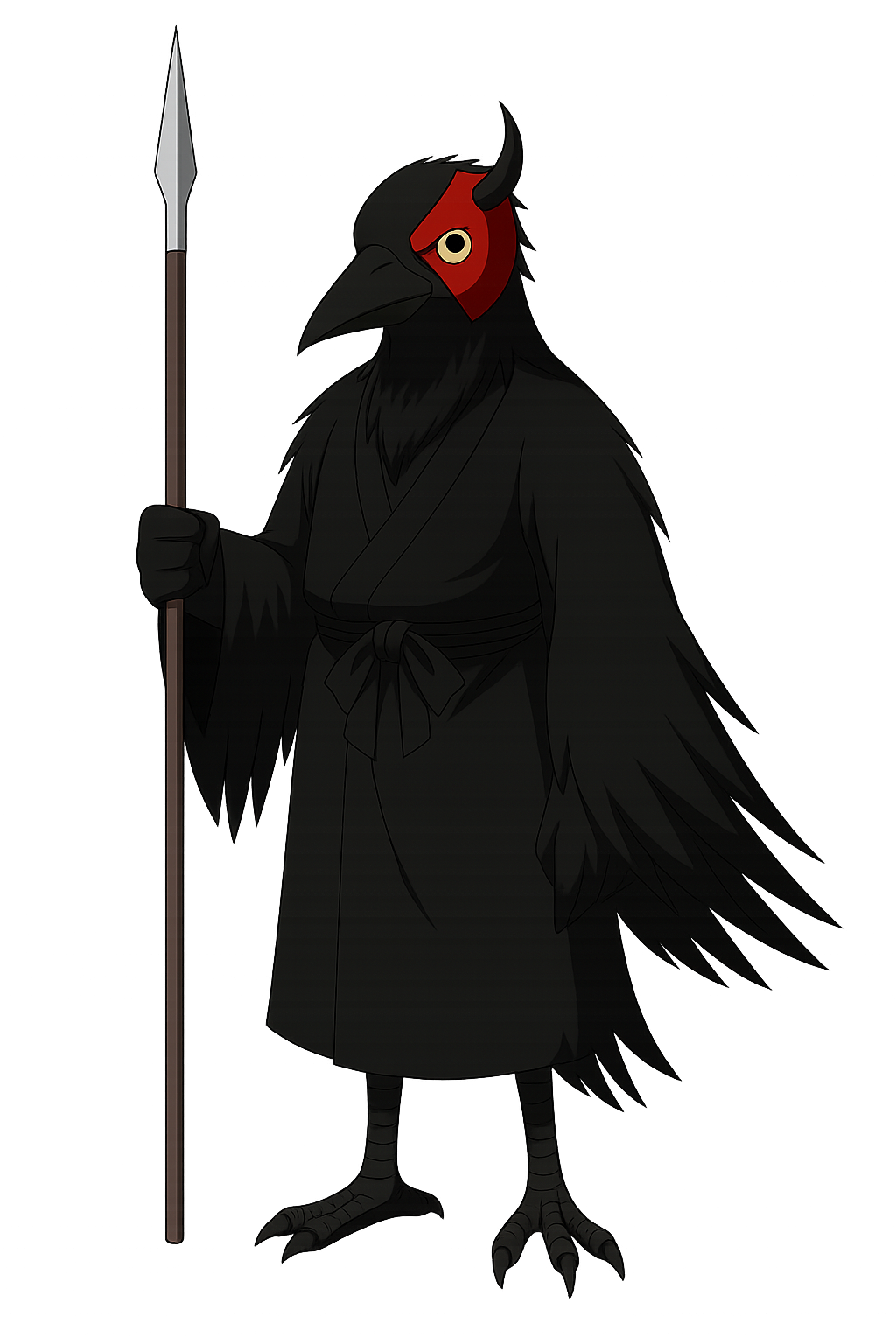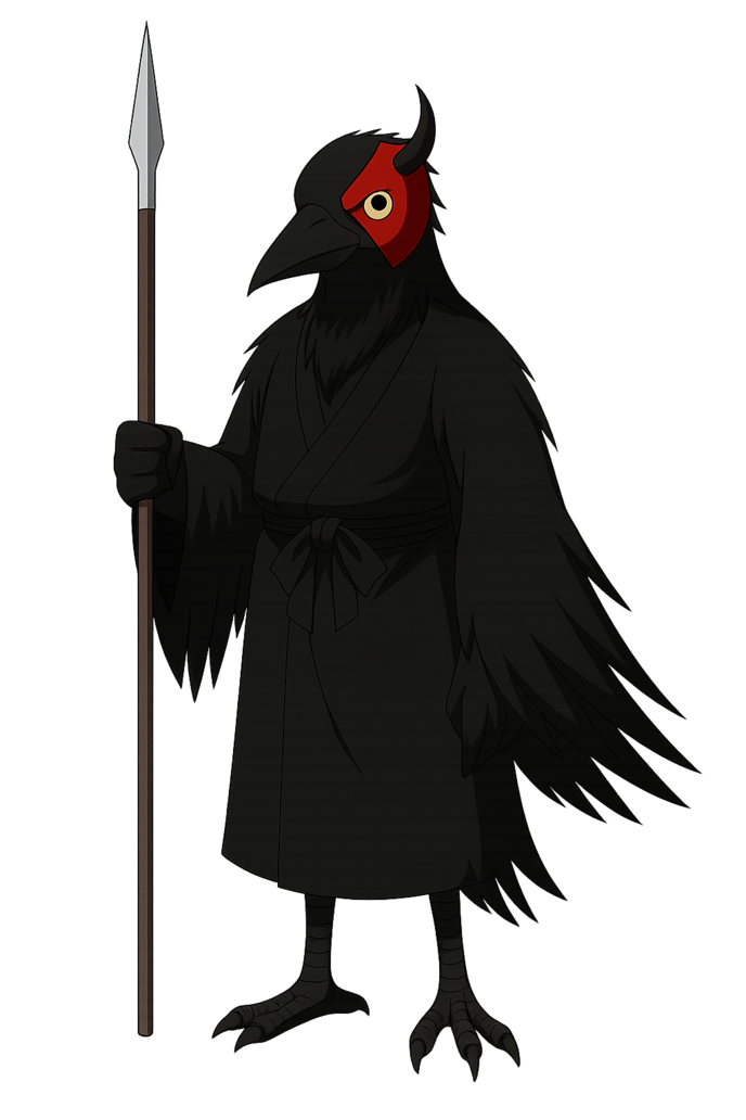 服は修験者のようないで立ち。顔は基本カラスの妖怪で、右目半分に深紅の仮面を付け仮面には短い角が2本生えている。
