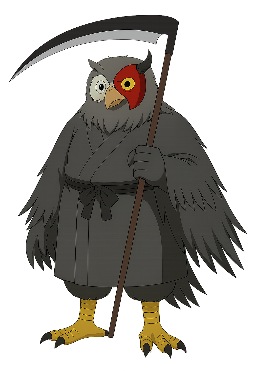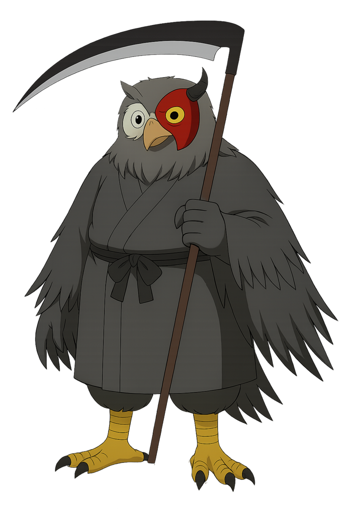服は修験者のようないで立ち。顔は基本フクロウの妖怪で、左目半分に深紅の仮面を付け仮面には短い角が2本生えている。