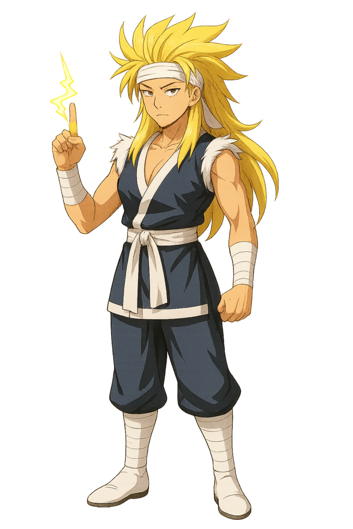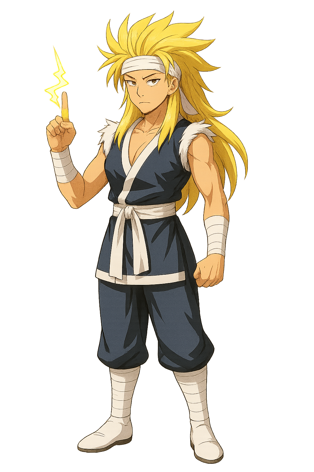 手は白い包帯で巻かれ、左利きで左手人差し指を立てている。黄色い雷を発する指輪をしている。