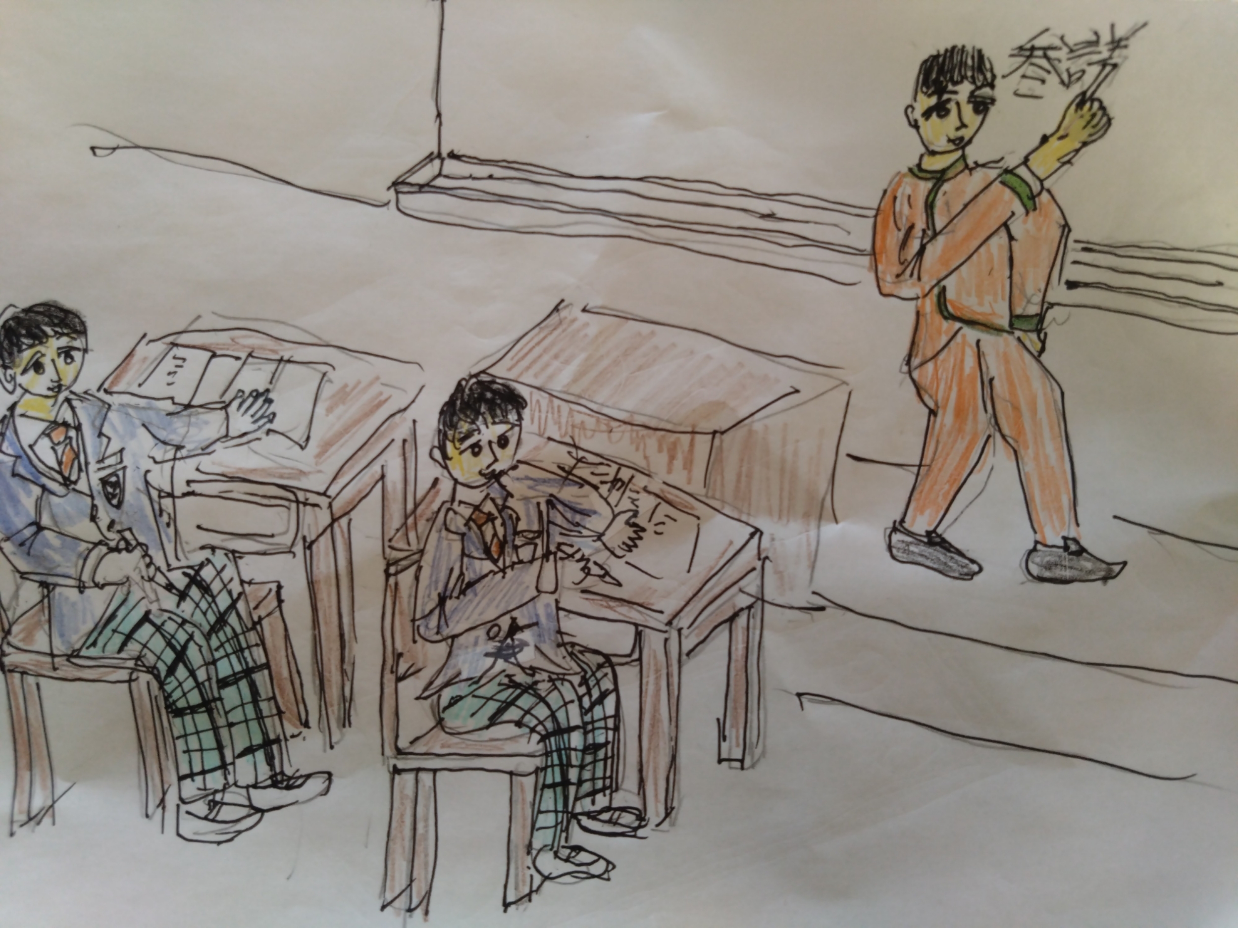 ベルボーイの仕事の合間に教壇に立ったこの日は着替えるヒマがなくてベルボーイの制服のまま登壇。生徒たちに冷やかされる11号であった