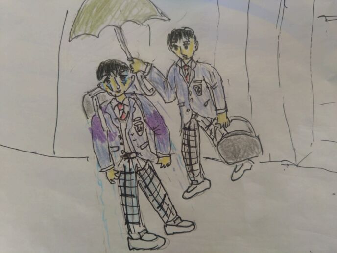 雨に濡れた制服。涙か雨粒か濡れた顔