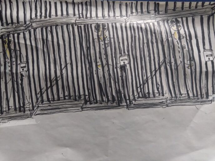 朝10時が点検だ。画像は一番に収容者の多いブロンズクラスの点検風景。全員、スライド式のドアーの前に立ち、調教師の点検を受ける