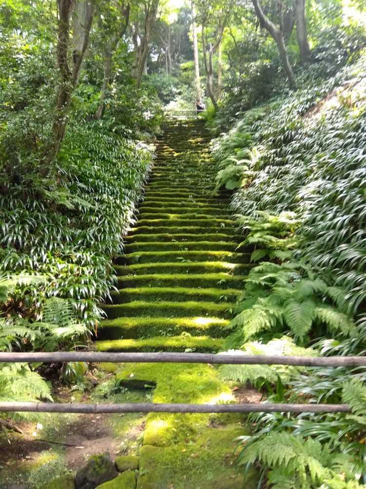 苔の寺でも有名で、本堂奥の仁王門の先に苔に覆われた渋い階段があります。保護のため登れませんが、横の階段を登りきると急な斜面の右上に護良親王の墓があります。