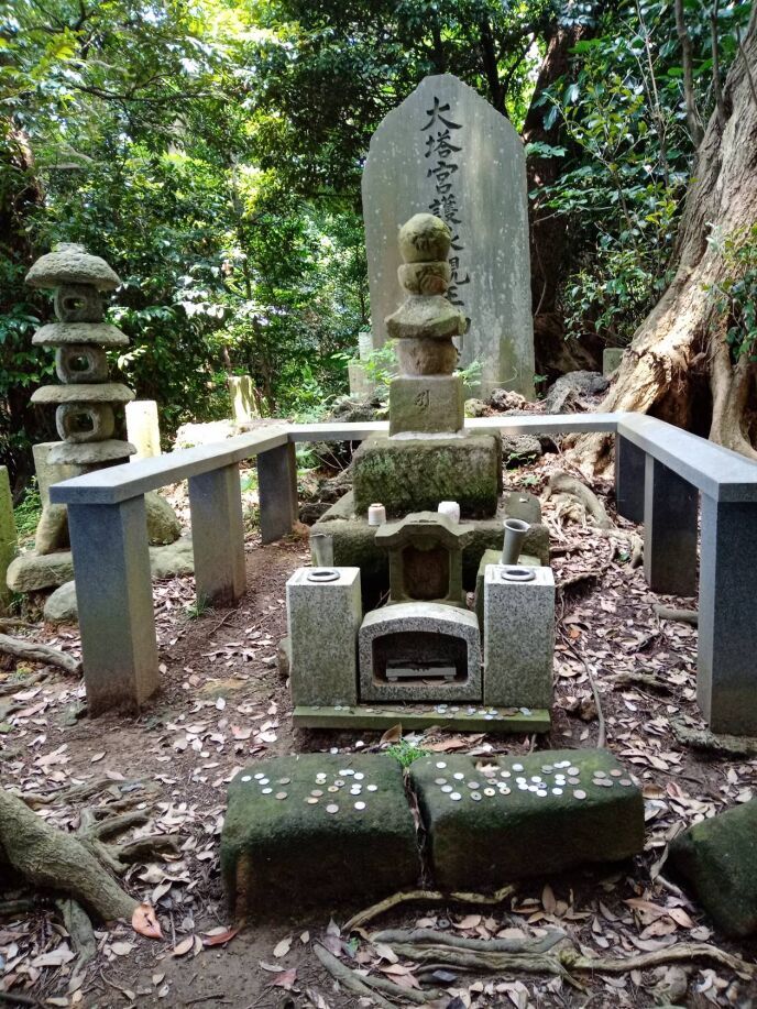 小さいながらも、卒塔婆が立っていてちゃんとしています。木が茂りすぎて海は見えず。南、残念だね…。