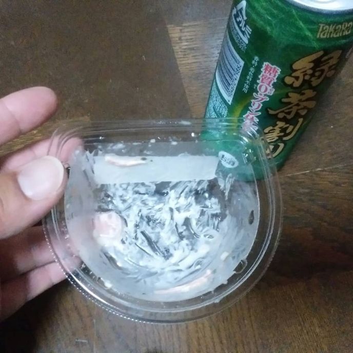 ☆・・・なんだかんだで帰宅は遅くなり、緑茶割りを、コンビニで買ったコールスローサラダでやる。