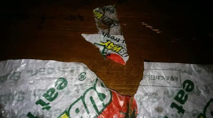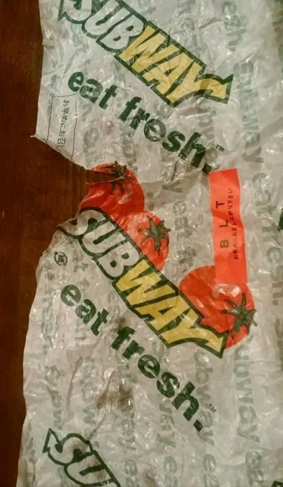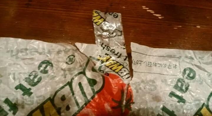食べ終え、後から(店に来てから)、ゴミとしてまとめて持っていた中から包み紙をとり出して確認すると、包み紙に欠損があった!