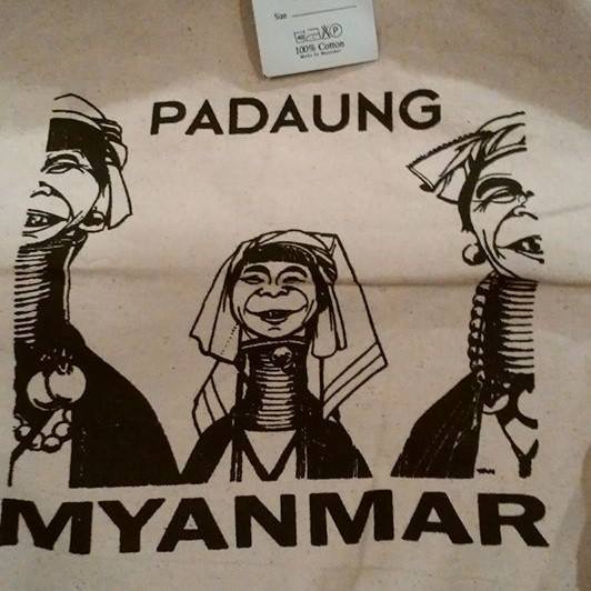 ミャンマーみやげの色んなデザインのトートバッグですが、常連さんに選んでいただきつつも売れ残っていた「ミャンマーの首長族」デザインが、砂乃龍夫妻のもとに貰われた。