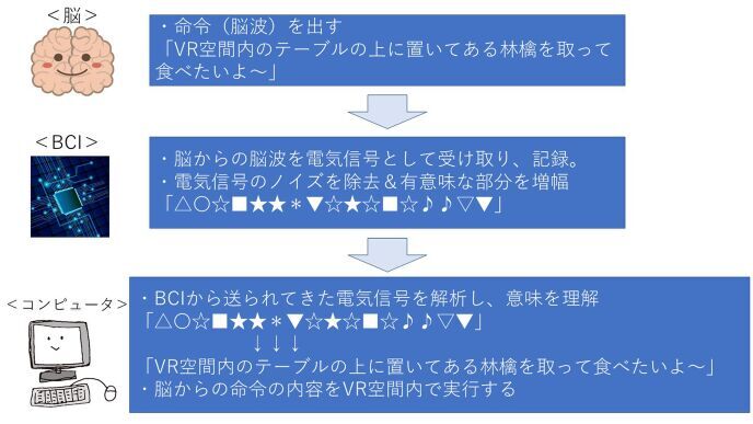 BCIとは、脳から出た命令――つまり脳波――を電気信号として記録し、それを肉体を介さず、直接コンピュータで読み取ってVR空間内のアバターを動かすことが出来る装置だ。