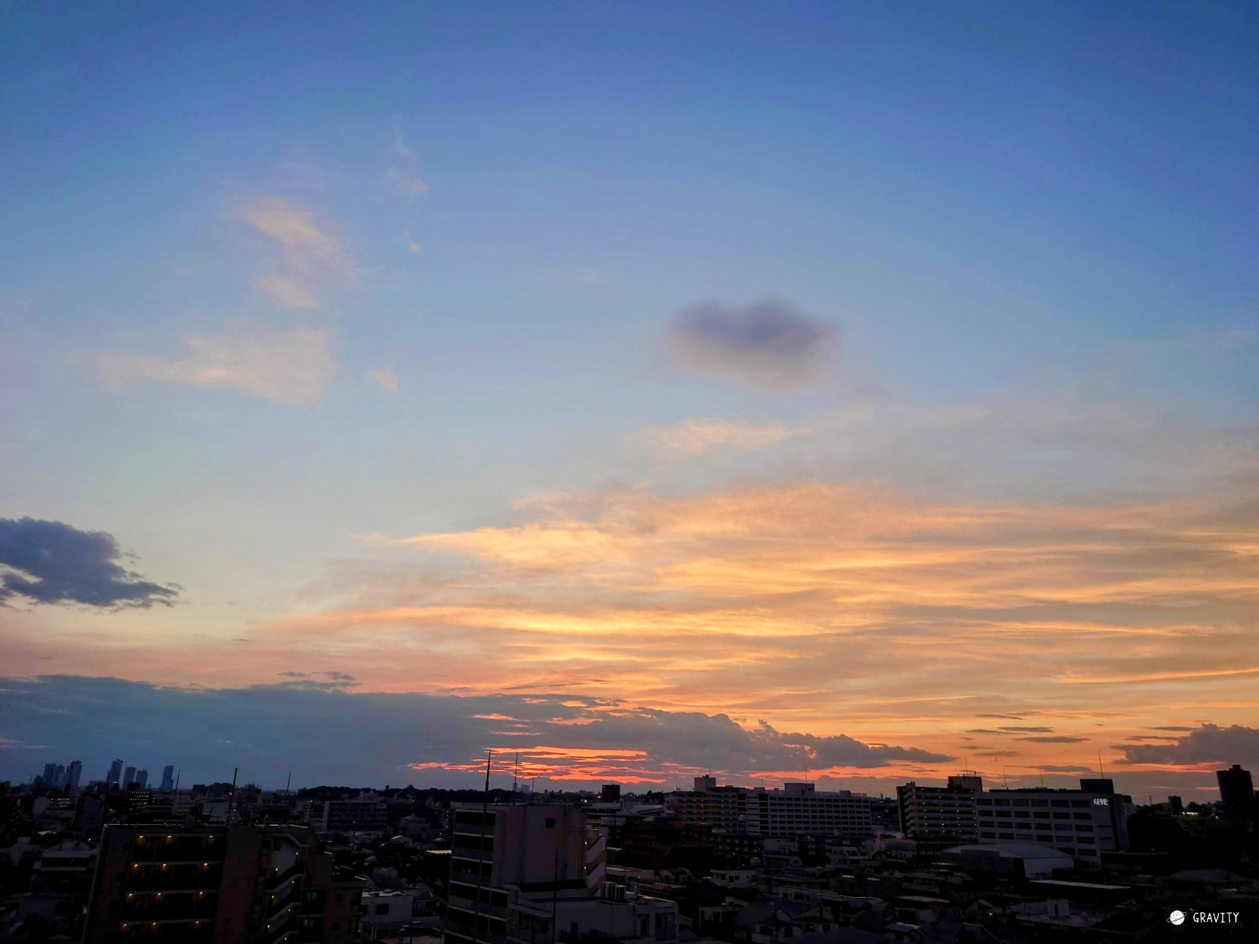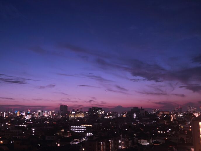 するときれいに別れていた夕陽の色と青空の色が、ちょうど今頃の時間の空のような淡い紫に変わります。