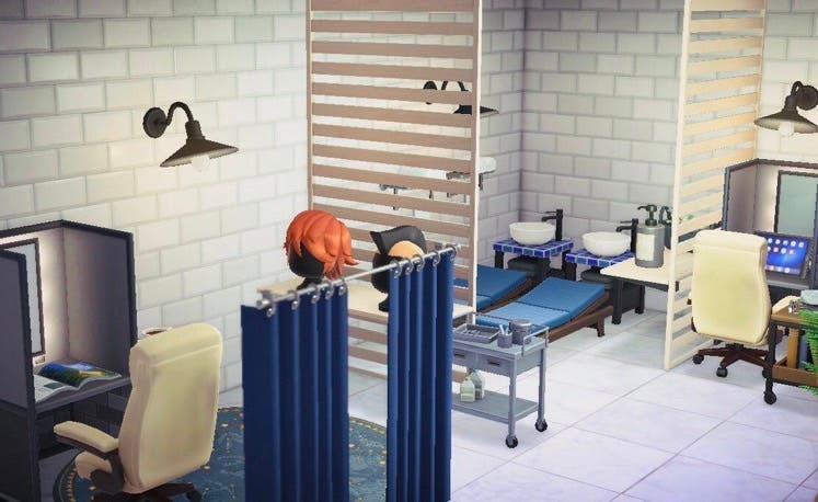 個室の青いカーテンの中。