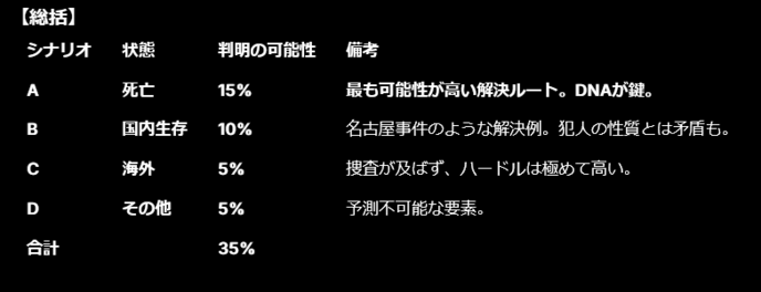 逆に言えば、**65%**の確率で、事件は永遠に真相が解明されないまま「未解決」で終わる可能性が高いと見ています。