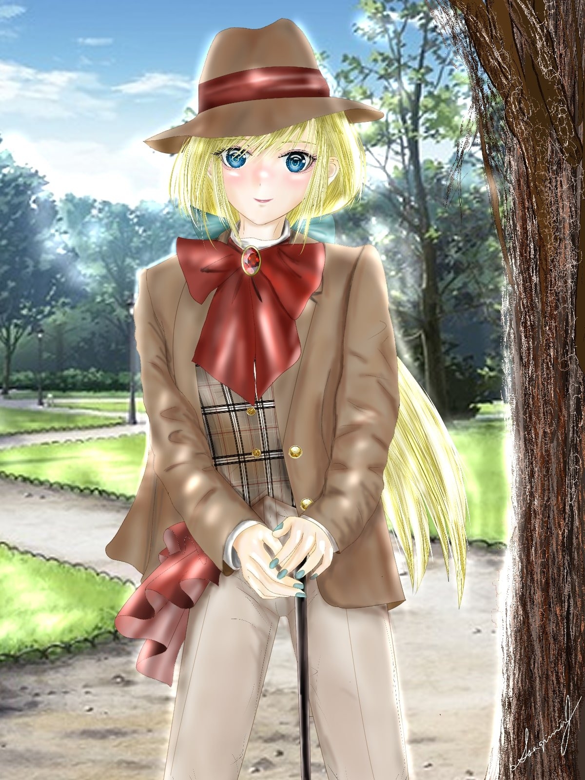 帽子と同じカーキ色の上着に溢れる結われた髪は 黄金のように輝いており、灰藍色のリボンで結んである。