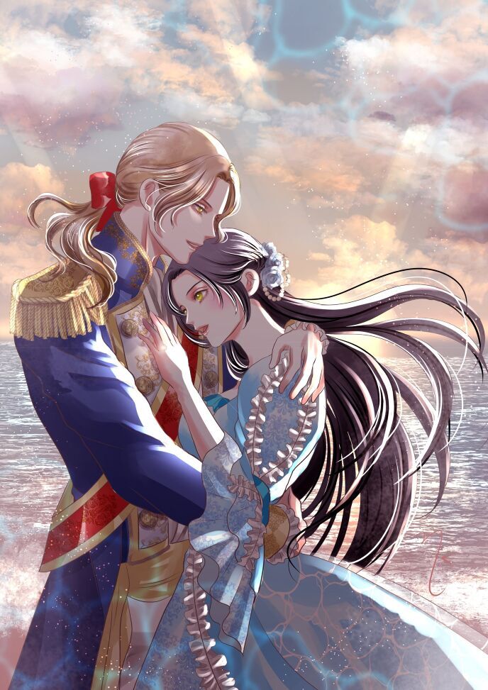心地よい風に吹かれながら二人で浜辺を歩いていた。アリオンは自分の左腕にレイアの手を絡めさせ、彼女が歩きやすいところへとエスコートしている。この入り江は戦争が起きても変わらず、ガリアの街を中心としたアルモリカをずっと見守り続けていた。時間的にもう少しで陽が沈むだろう。青い空から色彩が消え失せ、街の背後から赤みが徐々に上へと空を染めて行き、次第に青から蒼へと変わってゆくこの瞬間を、彼はレイアに見せたかったのだ。