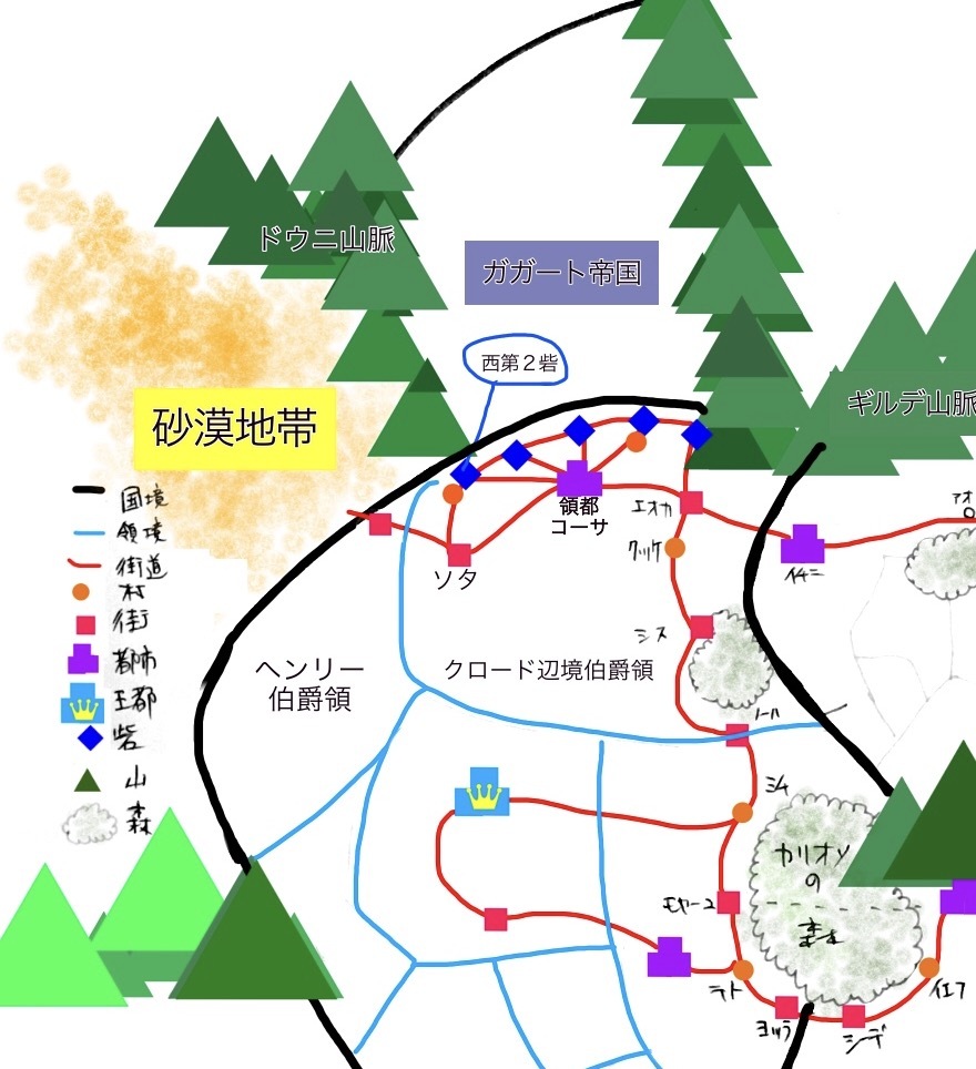 砂漠地帯に行くにはコーサから西第2砦からドウニ山脈(砂漠地帯とガガート帝国の間の山脈)へと入るコース。距離的にはこっちの方が短い。